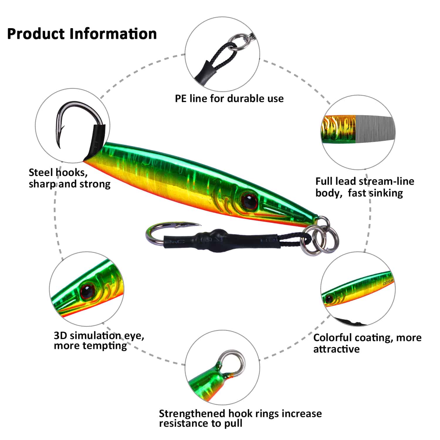 | Material | Fishing Hook: High carbon steel, Fishing Lure: Lead |